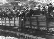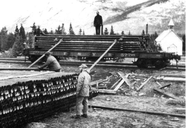 Unloading pipe for Canol pipeline at Carcross in WWII. |